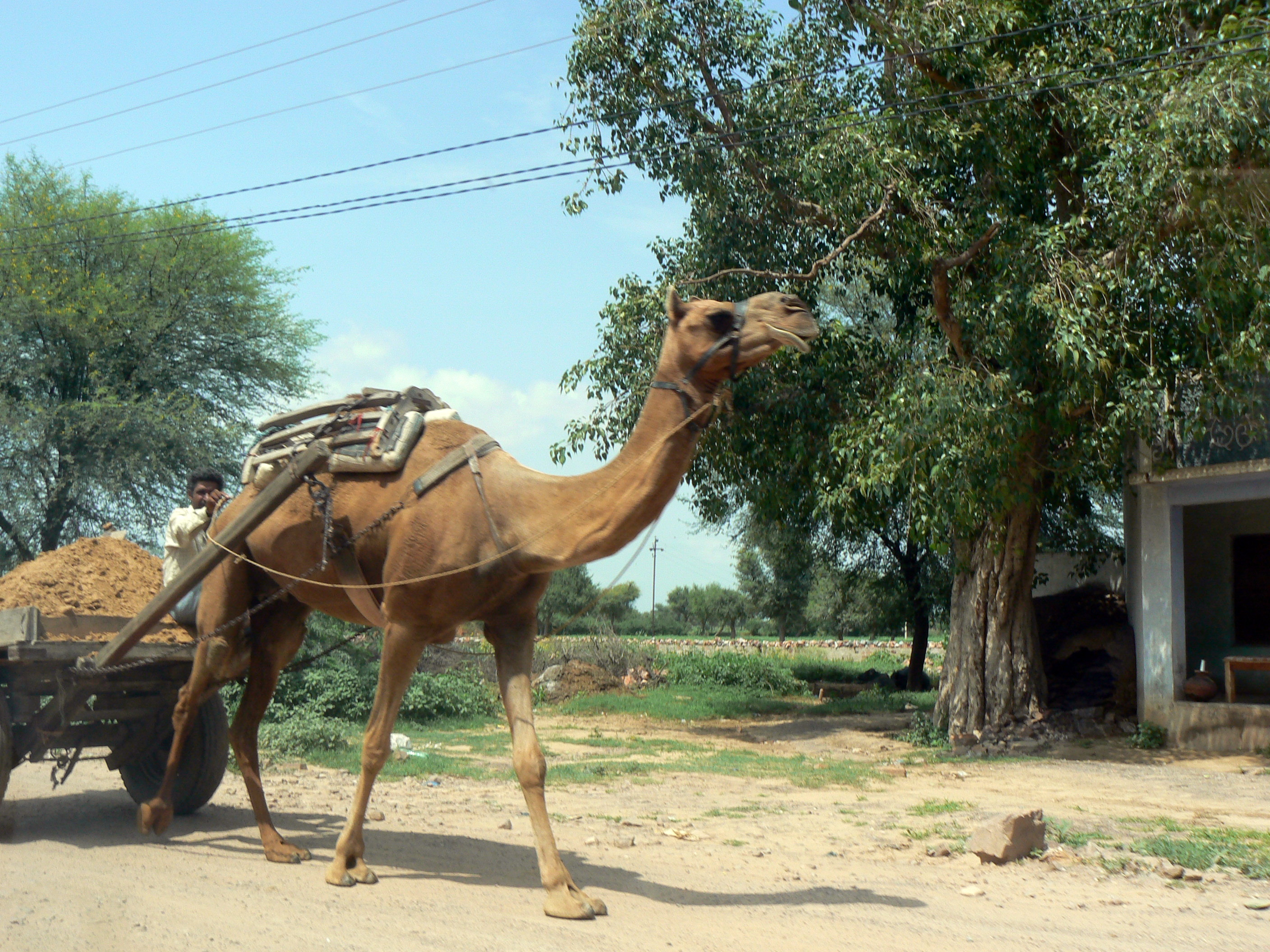 Nous croisons beaucoup d’animaux : ânes, moutons, chèvres et vaches bien sûr qui ont le droit de traverser les routes quand elles veulent et comme elles veulent. Nous constatons que les indiens utilisent ici beaucoup les chameaux pour tirer des charrettes ou même pour se déplacer.